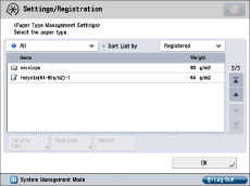You can sort the paper type list by registration date ([Registered]), name ([Name]), or basis weight ([Basis Weight]) from the Sort List drop-down list.