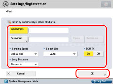 If you enter a pause at the end of the number, the pause is always 10 seconds long. Press [Set Details] to set the subaddress, password, ECM TX, Sending Speed, and Long Distance. If the machine is set to use multiple lines, you can also select the line to use when sending.