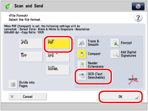 Select [PDF] → [OCR (Text Searchable)] → press [OK].