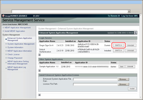 Default Authentication (Department ID Management) is set to a usable state as the default. If you want to use SSO-H, set [Department ID Management] to 'Off' before changing the login service. For more information on Department ID Management settings, see "Specifying Department ID Management."