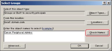 Enter 'Canon Peripheral Admins' in the group selection dialog box → click [Check Names].
