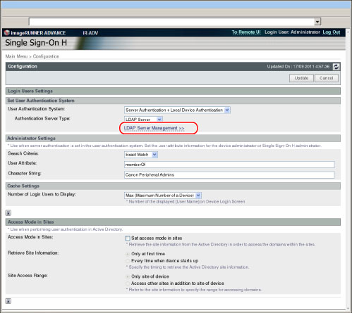You can click [LDAP Server Management] only if you select [Server Authentication + Local Device Authentication] for [User Authentication System] and [LDAP Server] for [Authentication Server Type].