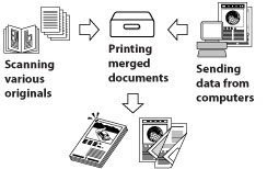 The Scan and Store function enables you to save document data that has been scanned from the scanner unit or created on a computer. The saved data can be printed at a specified time, or merged with separately saved data or data created on a computer for simultaneous processing.