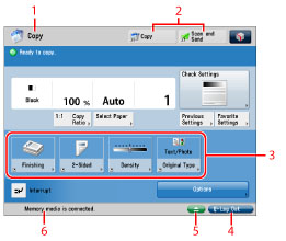 The progress of jobs and copy operations, and the status of devices and consumables are displayed here. Also, depending on the login service you are using, the Department ID or user name can be displayed.