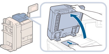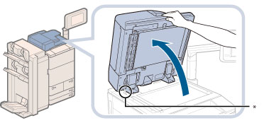 This machine is equipped with an open/close sensor of the feeder (see circled area in the above illustration). When placing originals on the platen glass, lift the feeder approximately 300 mm so that the sensor detaches from the feeder. If the sensor does not detach from the feeder, the size of the originals may not be detected correctly.
