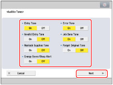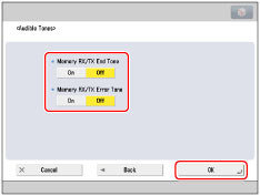 [Memory RX/TX End Tone] and [Memory RX/TX Error Tone] can be set when the Fax function is available. For information on the optional products required to use the Fax function, see "Optional Products Required for Each Function."