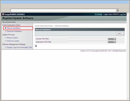From the portal page of the Remote UI, click [Settings/Registration] → [License/Other] → [Register/Update Software].