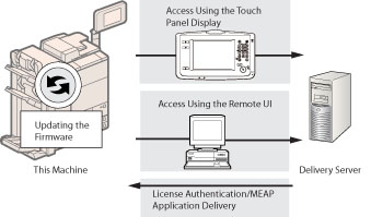 You can update the firmware of the machine to the most recent version using the "Register/Update Software." You can use this function from both the touch panel display and the computer (Remote UI).