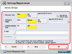 If the delivery settings are specified, downloaded firmware, firmware that is scheduled to be updated, and delivery reservations are deleted. Confirm before specifying the settings.