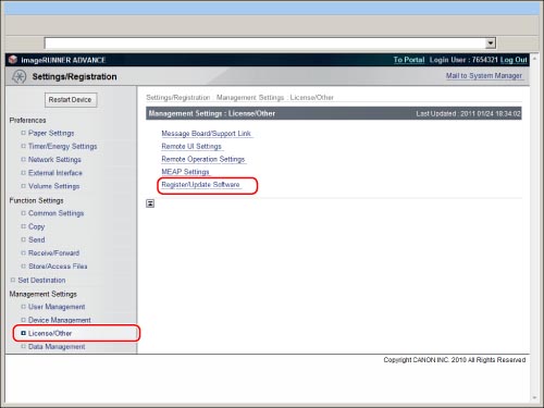 From the portal page of the Remote UI, click [Settings/Registration] → [License/Other] → [Register/Update Software].