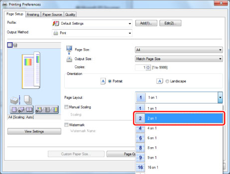 In the [Page Setup] sheet, select [2 on 1] from [Page Layout].