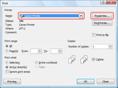 From the [File] menu of the application software you are using to print the document, select [Print] to display the [Print] dialog box → select the printer to use → click [Properties].