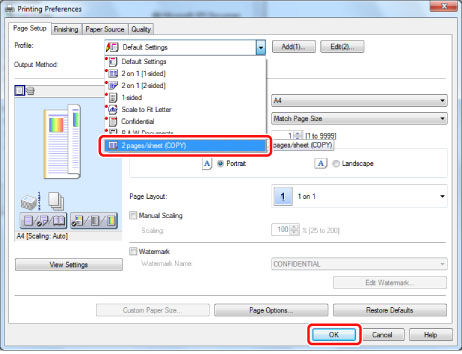 Select [2 pages/sheet (COPY)] from [Profile] → click [OK].