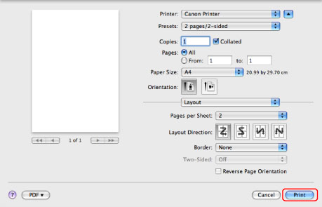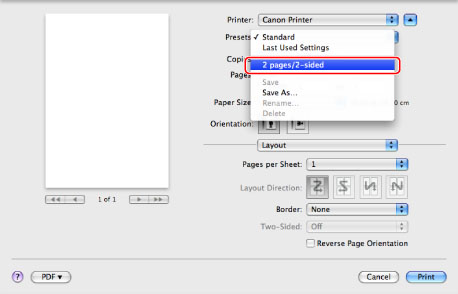 Select the printer to use →select [2 pages/2-sided] from [Preset].