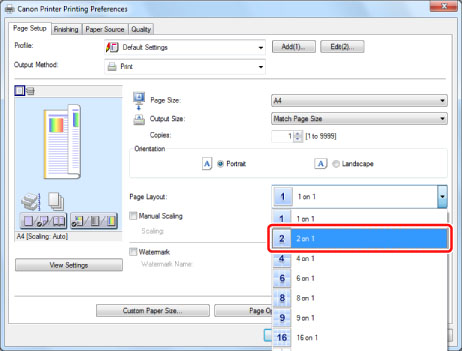 In the [Page Setup] sheet, select [2 on 1] from [Page Layout].
