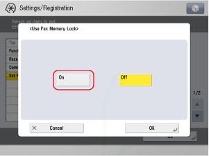 → [Function Settings] → [Receive/Forward] → [Common Settings] → [Set Fax/I-Fax Inbox] → [Use Fax Memory Lock].