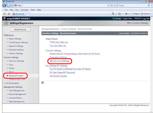 Access the Remote UI → click [Settings/Registration] → [Receive/Forward] for <Function Settings> → [Memory Lock Settings].
