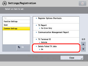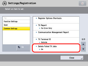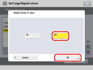 → [Function Settings] → [Send] → [Common Settings] → [Delete Failed TX Jobs].