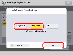 → [Function Settings] → [Receive/Forward] → [Common Settings] → [Handle Files with Forwarding Errors] → select [Store/Print] → press [OK].