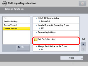 → [Function Settings] → [Receive/Forward] → [Common Settings] → [Set Fax/I-Fax Inbox].