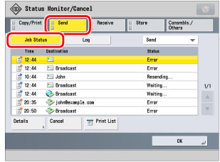 The status of all send jobs (fax, internet fax, file transmission, e-mail, and forward) are displayed, and <Error> appears for forwarding errors in the same way as other transmission errors.