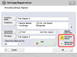 You can set to send e-mail notification only when a forwarding error occurs. Select a forwarding condition → press [Details/Edit] → select [Fwd Done Notice] and [Notice Only for Errors].