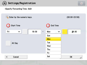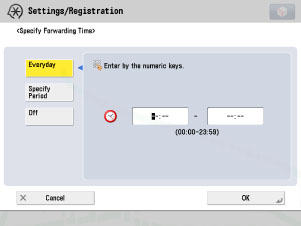 By selecting [Specify Fwd Time], you can set to validate/invalidate forwarding settings based on the day or time. For example, you can set to invalidate forwarding at times when the computer is turned OFF, such as during evening hours and non-working days.