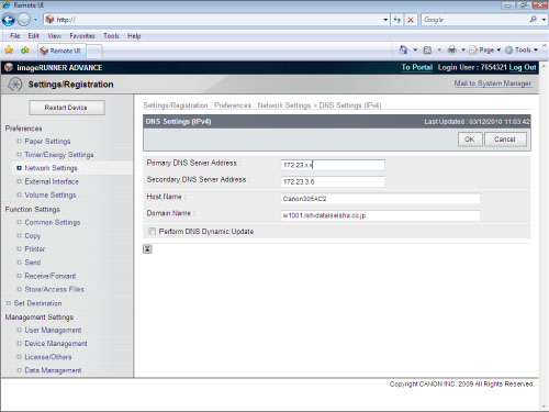 → [Preferences] → [Network] → [TCP/IP Settings] → [DNS Settings].If the imageRUNNER ADVANCE machine continuing to issue packets to the DNS server is causing excessive network traffic, you can disable dynamic DNS updating after communication is complete. However, this is only if you have a server in your company, and your environment is not a DHCP environment (your environment must use fixed IP address and host names).