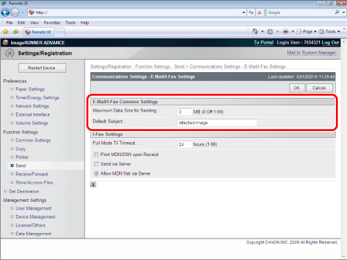 → [Function Settings] → [Send] → [E-Mail/I-Fax Settings]. |