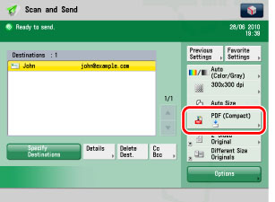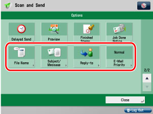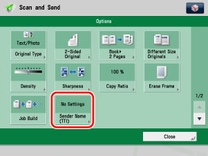 You can only select settings stored in advance for "Sender Name" and "Reply to." You cannot enter a new destination on the Options Screen. Store the destination in Settings/Registration. The "Sender Name" displayed on the reception screen is the unit name set for the imageRUNNER ADVANCE machine that is sending. The "Sender Name" setting is not reflected.
