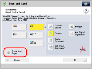If you select [PDF], [XPS], [TIFF] or [OOXML], you can use the Divide into Pages mode.