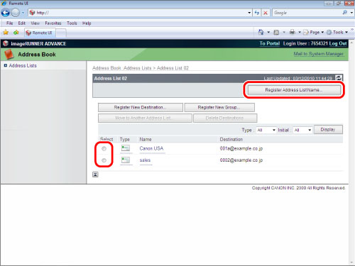 Access the Remote UI → click [Address Book] → select the address list from the list.