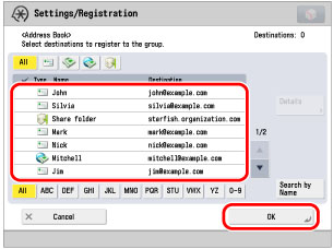 Press [Add from Address Book] → select the e-mail addresses that you want to store in the group → press [OK].