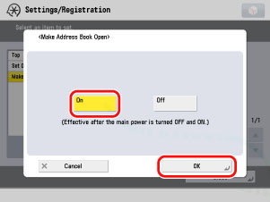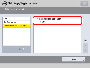 Access the Remote UI → click [Settings/Registration] → [Set Destination] → [Make Remote Address Book Open].