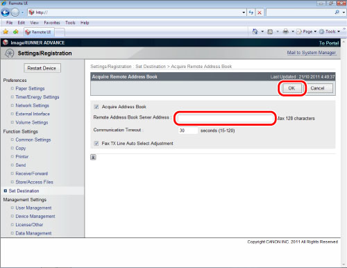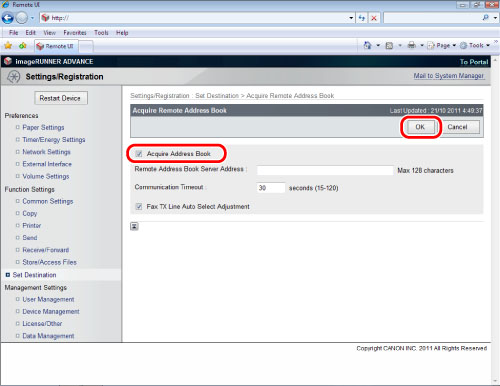 Access the Remote UI → click [Settings/Registration] → [Set Destination] → [Acquire Remote Address Book].