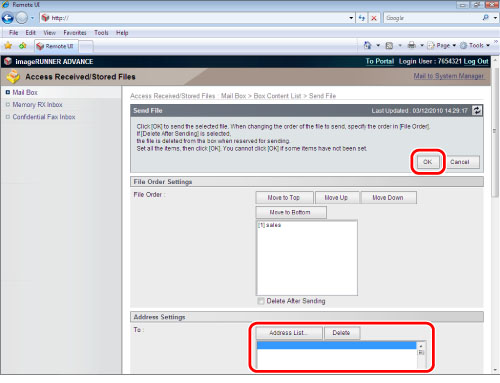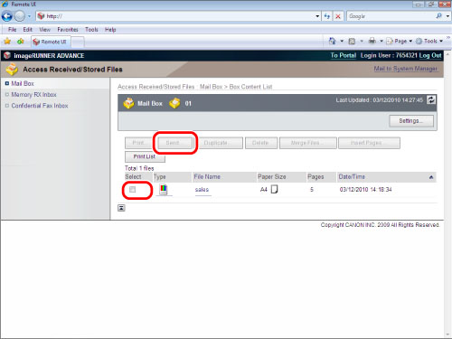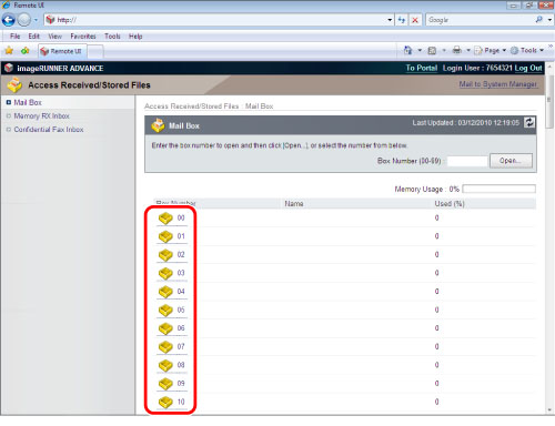 Access the Remote UI → click [Access Received/Stored Files] → [Mail Box] → select the Mail Box number where the document is stored.