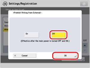 → [Function Settings] → [Store/Access Files] → [Advanced Space Settings] → [Prohibit Writing from External].