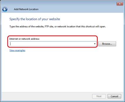 For Windows Vista/Windows 7, click [Computer] → right-click a blank area in the displayed folder → click [Add a Network Location] → [Next] → [Next] → enter the following path for <Internet or network address:>. (Case sensitive.)