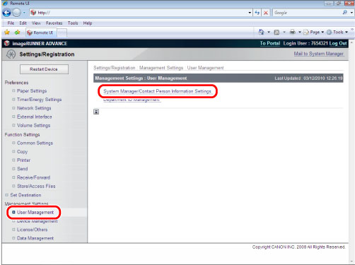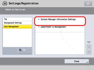 Access the Remote UI → click [Settings/Registration] → [User Management] → [System Manager/Contact Person Information Settings].