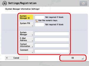 Select [Set ID and PIN] → enter a maximum of seven digits in [System Manager ID] → select [Change PIN] → enter a maximum of seven digits for [System PIN] and [Confirm]. The System Manager ID and System PIN are necessary when logging in to Settings/Registration.