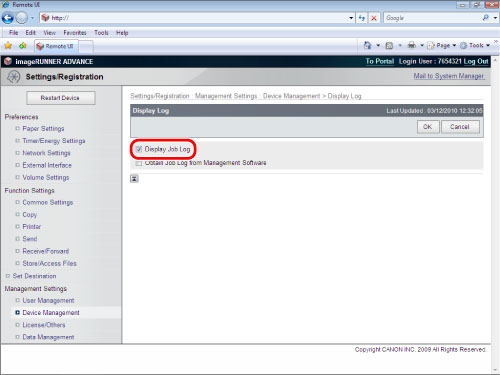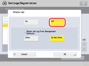 Select [Allow] or [Do Not Allow] for <Obtain Job Log with Management Software> → press [OK].