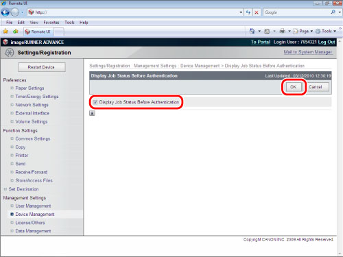 To specify the job status before authentication display settings, click [Display Job Status Before Authentication] → deselect [Display Job Status Before Authentication] → click [OK].