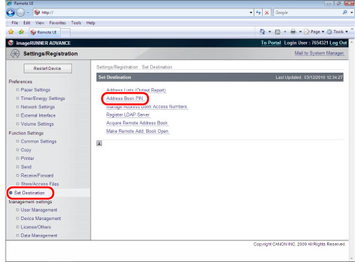 Access the Remote UI → click [Settings/Registration] → [Set Destination] → [Address Book PIN].