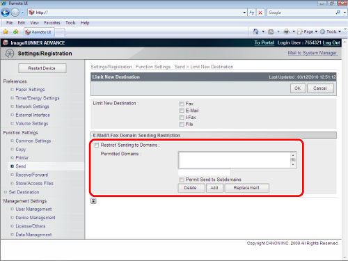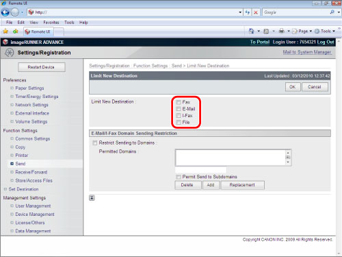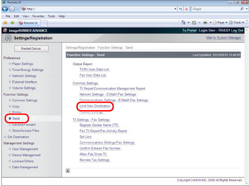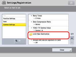 Access the Remote UI → click [Settings/Registration] → [Send] → [Limit New Destination].