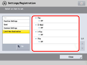 → [Function Settings] → [Send] → [Common Settings] → [Limit New Destination].