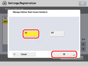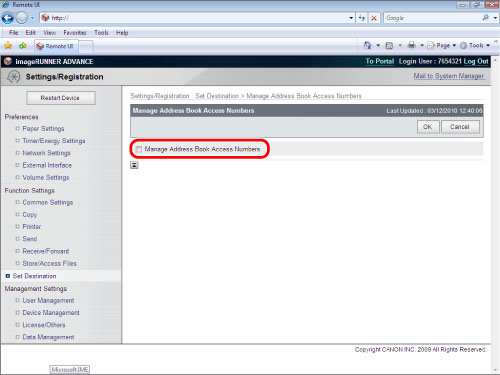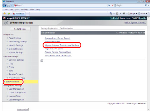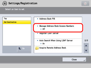 Access the Remote UI → click [Settings/Registration] → [Set Destination] → [Manage Address Book Access Numbers].