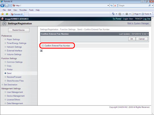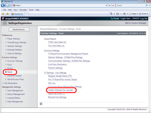 Access the Remote UI → click [Settings/Registration] → [Send] → [Confirm Entered Fax Number].