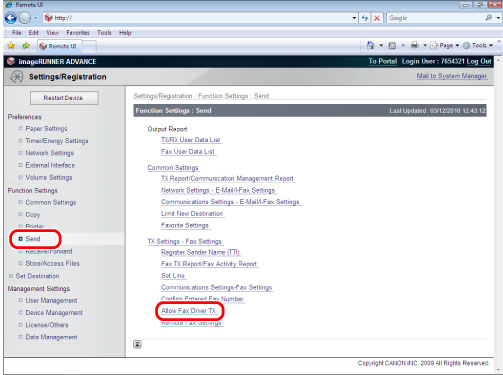 Access the Remote UI → click [Settings/Registration] → [Send] → [Allow Fax Driver TX].