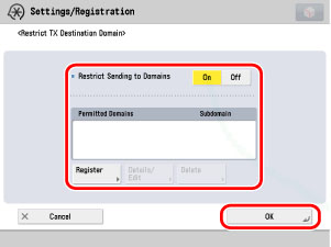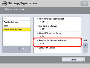 → [Function Settings] → [Send] → [E-Mail/I-Fax Settings] → [Restrict TX Destination Domain].