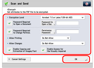 You can set a password for opening a PDF file or encrypt the PDF file itself for sending. If you set a password for a PDF file, only recipients who enter the correct password can open, edit, or print the file. Also, you can grant editing/operating privileges according to the sensitivity of the information (optional kit required).